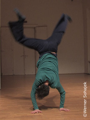Nach einem warm-up u.a.mit Elementen aus Yoga und gezielten Alignment- und Kräftigungsübungen erforschen wir die Prinzipien dreidimensionaler Bewegungsabfolgen (3-D flow movement). Wir erspüren neue Verbindungen im Körper und lassen daraus Bewegungen entstehen, die wir immer mehr zu raumgreifenden Tanzsequenzen erweitern. Ob “moves” aus dem Boden/in den Boden, spiralförmige Bewegungen, Drehungen, Rollen und Sprünge, kopfüber- und auf den Händen tanzend – ständig sind wir auf der Suche nach Dynamik, Fluss und Leichtigkeit.